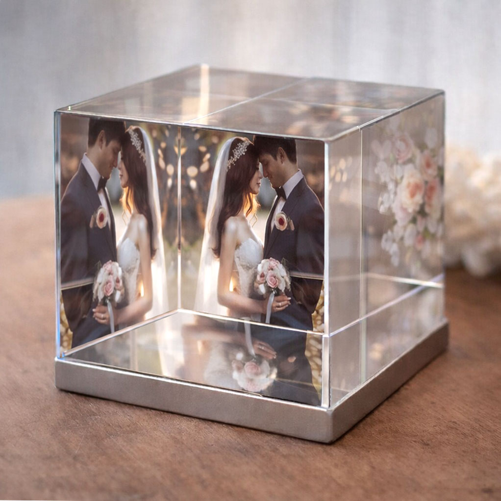 Dit unieke glasblok fotokado is een stijlvolle en emotionele manier om dierbare herinneringen vast te leggen. Dankzij het transparante ontwerp en de luxe afwerking komt elke afbeelding prachtig tot zijn recht. Het glasblok wordt geleverd in een strakke metalen tray, wat zorgt voor een moderne en hoogwaardige uitstraling die past in elk interieur.